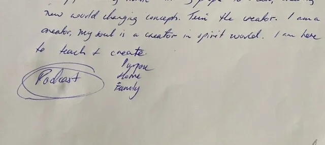 During a meditation whilst in our group session, my guides came forward and showed me an image of me seated by a laptop, and talking into a microphone. I was busy writing down all that I saw and heard in this meditation as so much was coming through and was all very vivid. When I came out of the meditation I saw that I had written “Podcast” with circles around it!